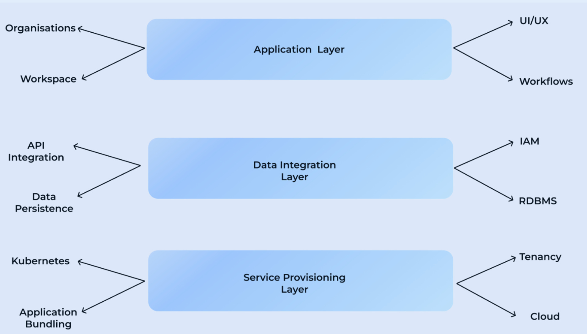 The application layer encompasses the UI/UX design, onboarding workflows, and user management aspects. This layer focuses on delivering a seamless user experience, tailored to the unique requirements of each application. Workflows can define mapping of a single organisation to a workspace or multiple workspaces.